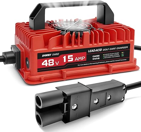 EPOWREY 48V 电池充电器适用于 Club Car 高尔夫球车,配备 3 针圆形插头。这款充电器采用橡胶电缆设计,比 PVC 更耐磨、耐热,提供有效的防水优势。